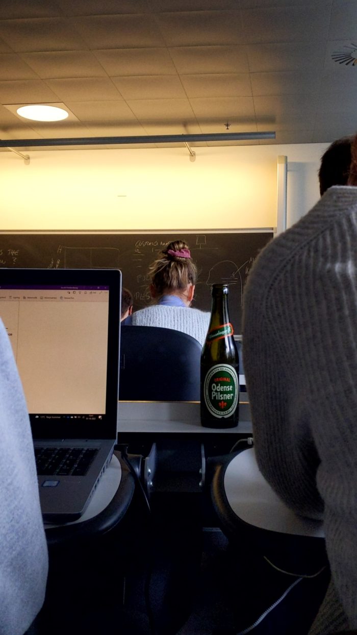 デンマーク人はビールが大好きです.物価が高いことでも知られているデンマークですが,ビールはコーラよりも安く,スーパーでは1瓶 2-3DKK (40-50円) 前後でビールが買えます.また,1人あたり消費量も日本人の1.8倍(「2020年 世界主要国のビール消費量」, キリンホールディングス株式会社)だそうです.そんなビールを愛する国の大学には,なんと,売店でビールが売っていますし,大学内にバーがあります.また,多くの大学や学校の寮にもバーがあるほどです.そのため,金曜日になると学食では,学生が集まり,ケース買いをしたビールを皆んなで囲む光景が日常でした.その波は授業にももちろん押し寄せ,下の写真にあるように,金曜日の午後の授業では,ビール片手に履修している人がいます.まあ,他の留学生に聞くと,デンマークだから許されるといっていました.